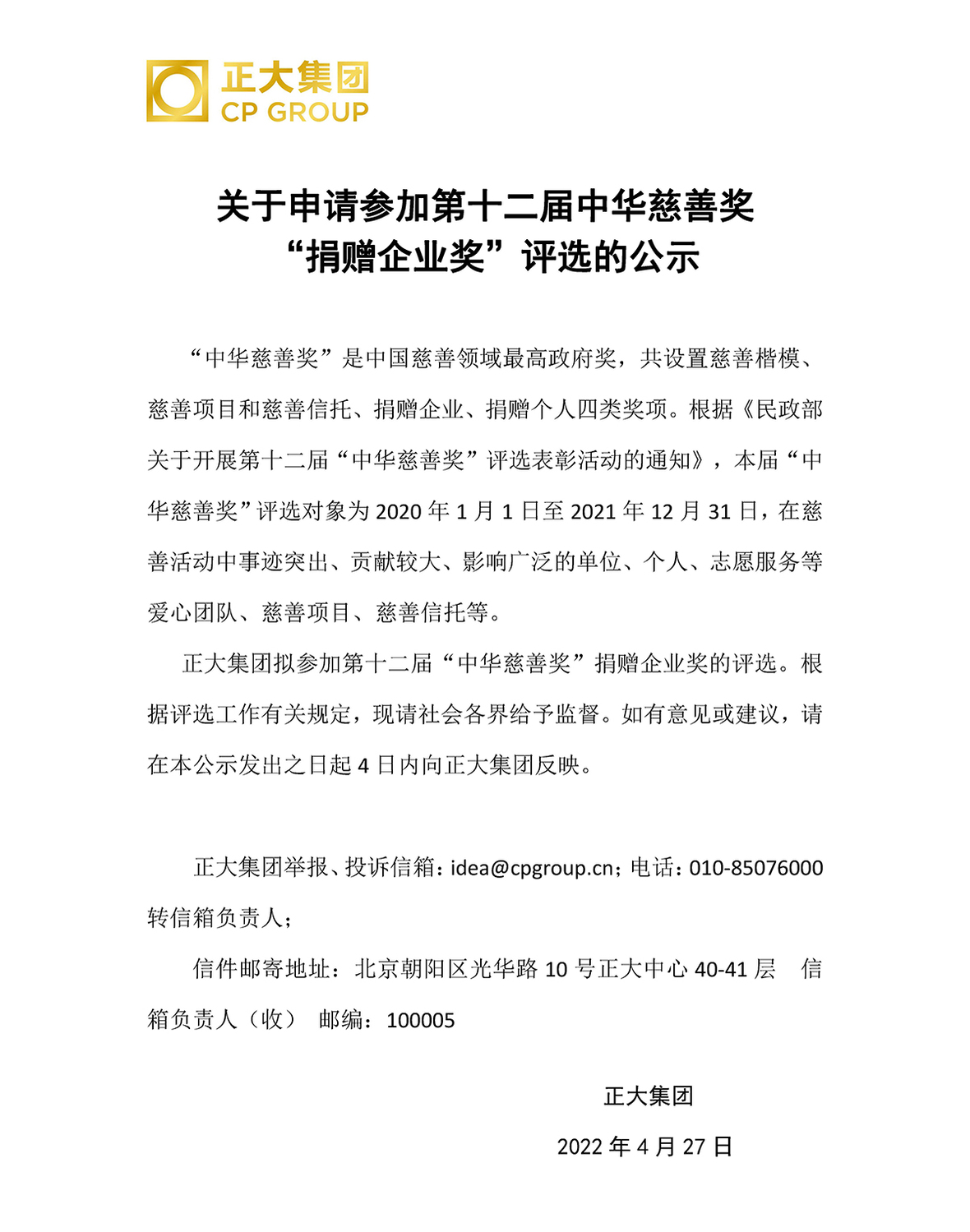 關(guān)于申請參加第十二屆中華慈善獎“捐贈企業(yè)獎”評選的公示