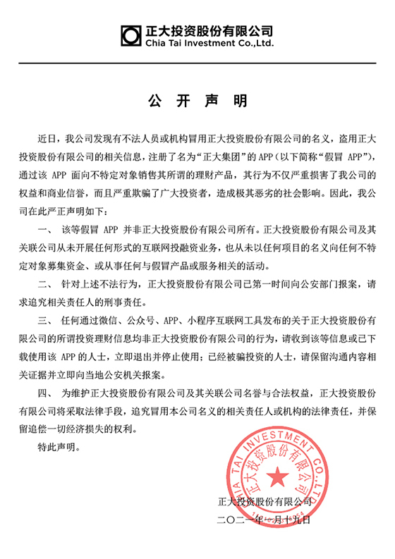 正大投資股份有限公司關于不法人員或機構冒名“正大集團”App的嚴正聲明如下: