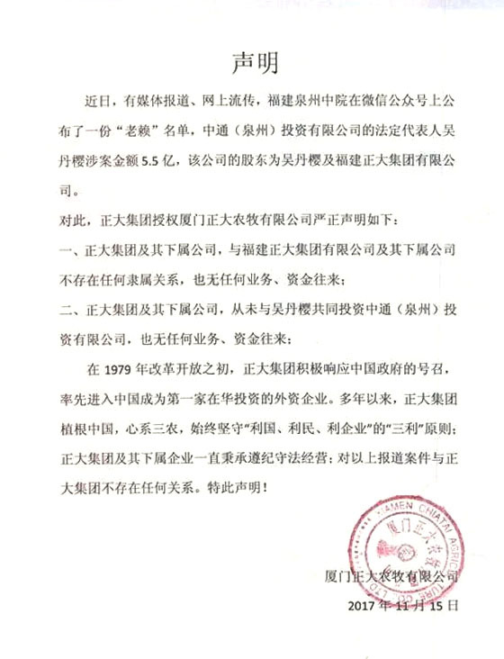 近日,有媒體報道、網(wǎng)上流傳,福建泉州中院在微信公眾號上公布了一份“老賴”名單,中通(泉州)投資有限公司的法定代表人吳丹櫻涉案金額5.5億,該公司的股東為吳丹櫻及福建正大集團有限公司。對此廈門正大農(nóng)牧有限公司發(fā)布聲明,內(nèi)容如下: