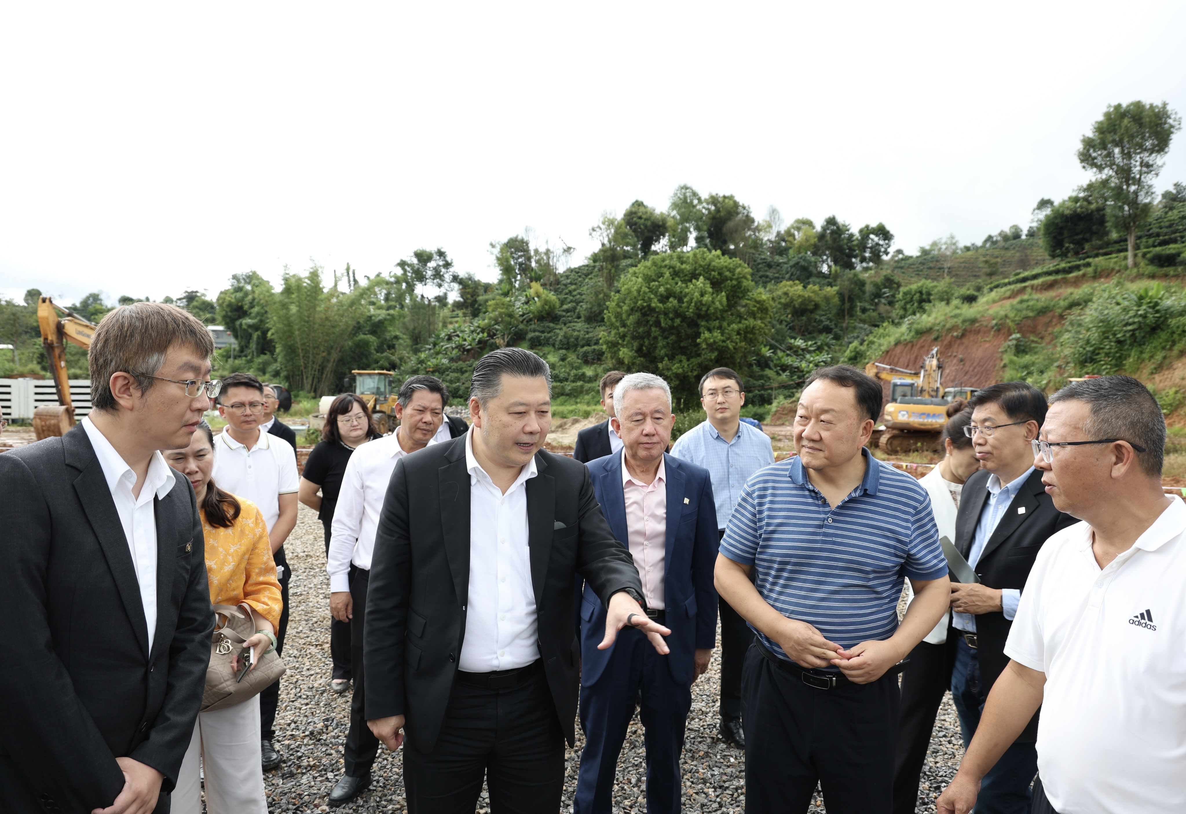 ▲謝吉人集團董事長(前排左二)同普洱市委常委、思茅區委書記胡選坤(前排右二)在項目現場交流。
