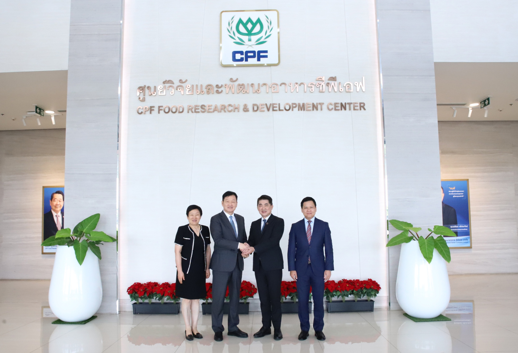 ▲在正大集團(tuán)CPF食品研發(fā)中心,Mr.Prasit Boondoungprasert(右二)、黃偉偉集團(tuán)資深副總裁(右一)熱情接待秦英林董事長(zhǎng)(左二)、錢(qián)瑛董事長(zhǎng)(左一)一行并陪同參觀。