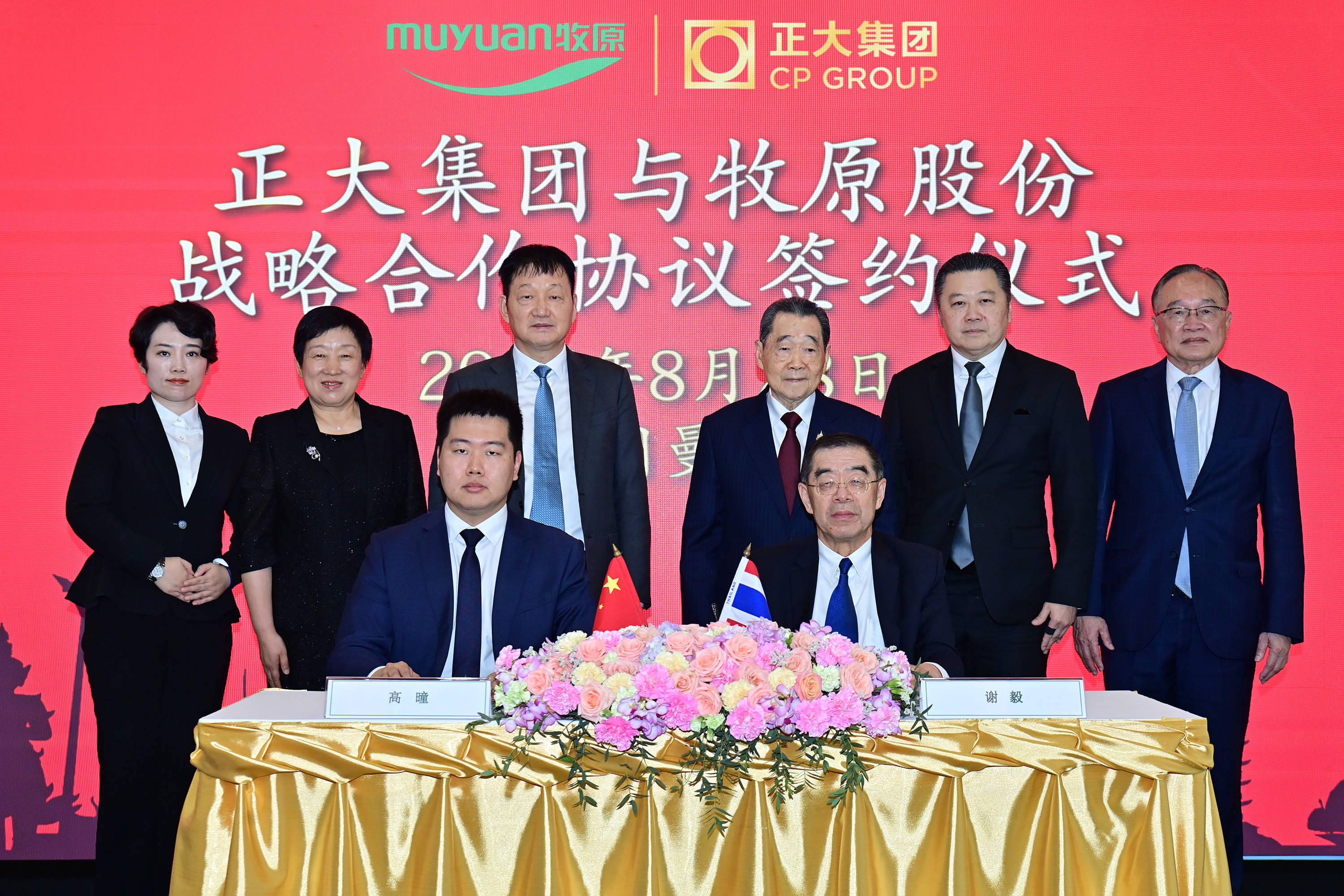 ▲謝國(guó)民集團(tuán)資深董事長(zhǎng)(后排右三)、謝吉人集團(tuán)董事長(zhǎng)(后排右二)、蔡益光集團(tuán)資深副董事長(zhǎng)(后排右一),秦英林董事長(zhǎng)(后排左三)、錢(qián)瑛董事長(zhǎng)(后排左二)、牧原股份首席獸醫(yī)師牛旻(后排左一)共同見(jiàn)證簽約。謝毅集團(tuán)資深副董事長(zhǎng)(前排右)、高曈首席財(cái)務(wù)官(前排左)分別代表雙方簽署協(xié)議。