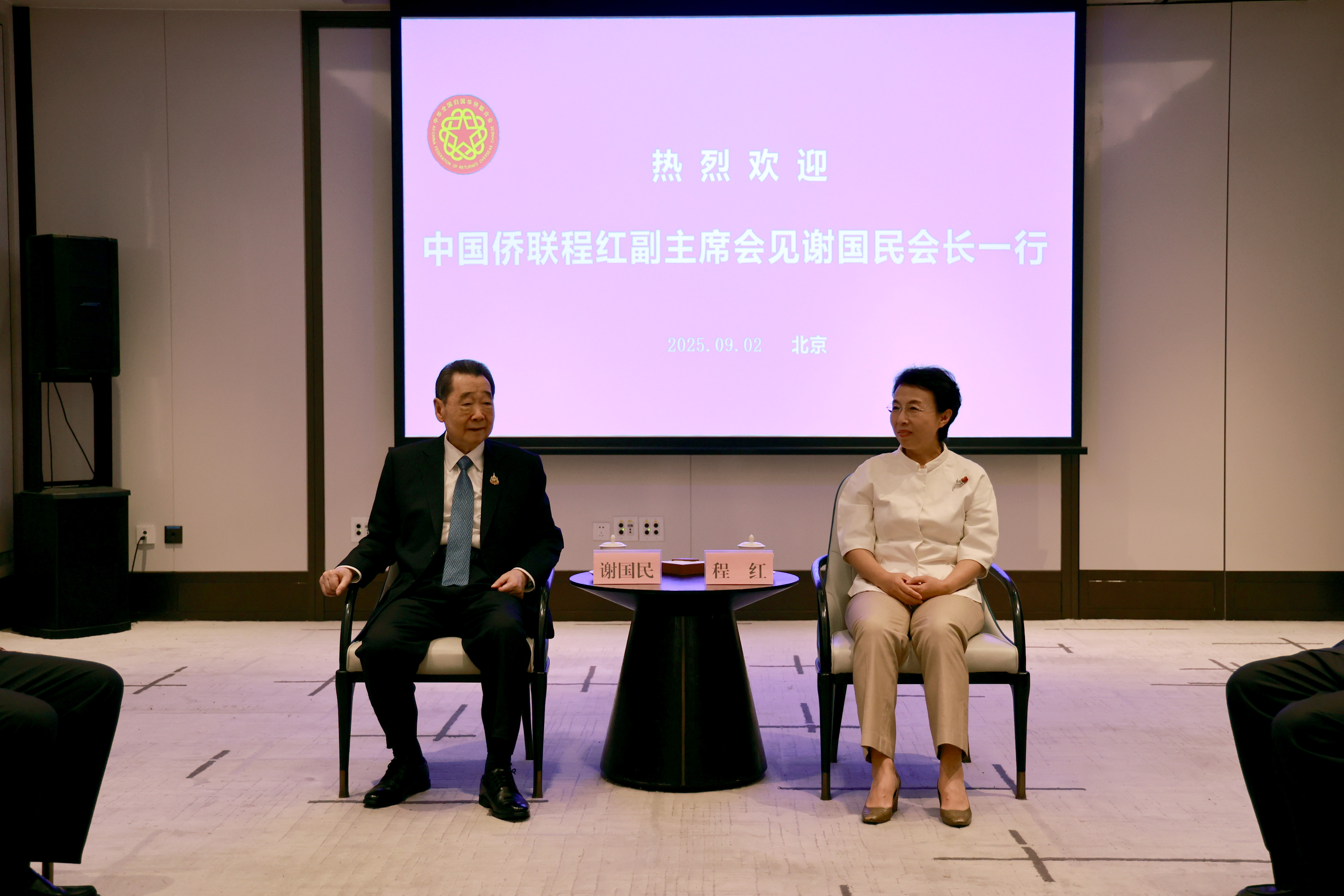 9月2日上午,中國僑聯副主席程紅在北京華僑大廈會見謝國民集團資深董事長、謝吉人集團董事長一行,雙方舉行了親切友好的會談。當天上午,謝吉人集團董事長還應邀參加了在京召開的中華海外聯誼會六屆二次常務理事會。