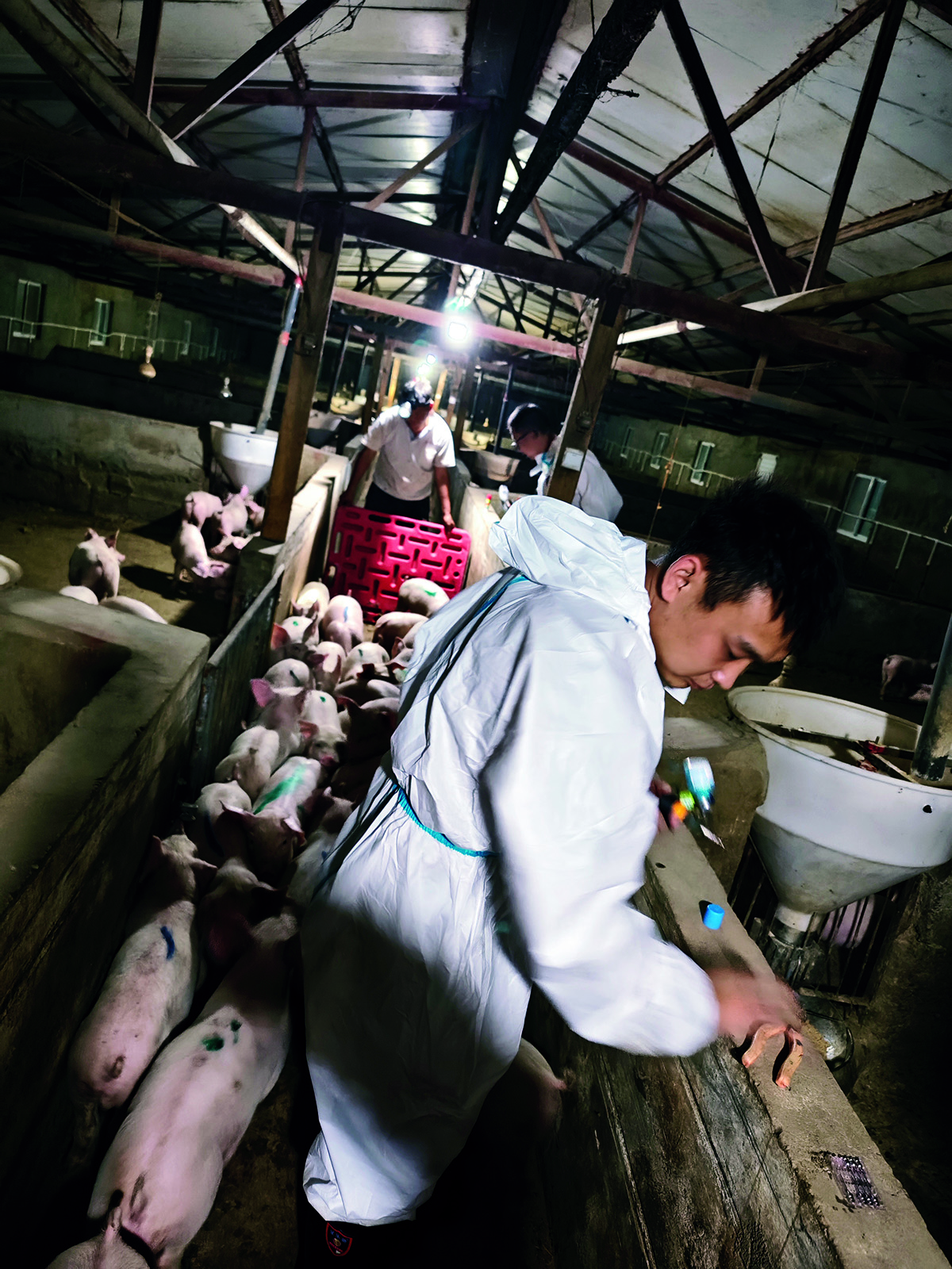 ▲張重陽為客戶養(yǎng)殖場的豬只注射疫苗。