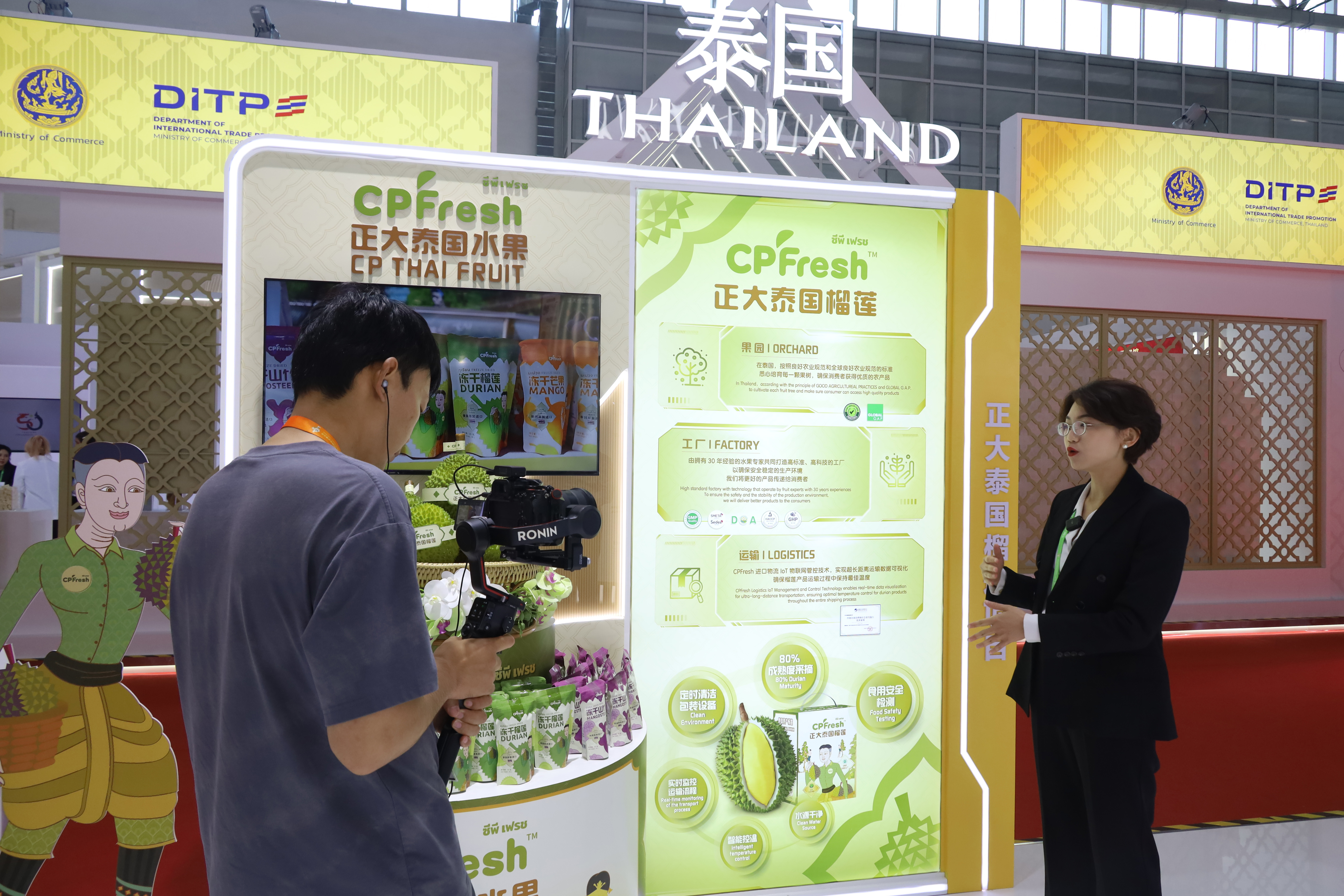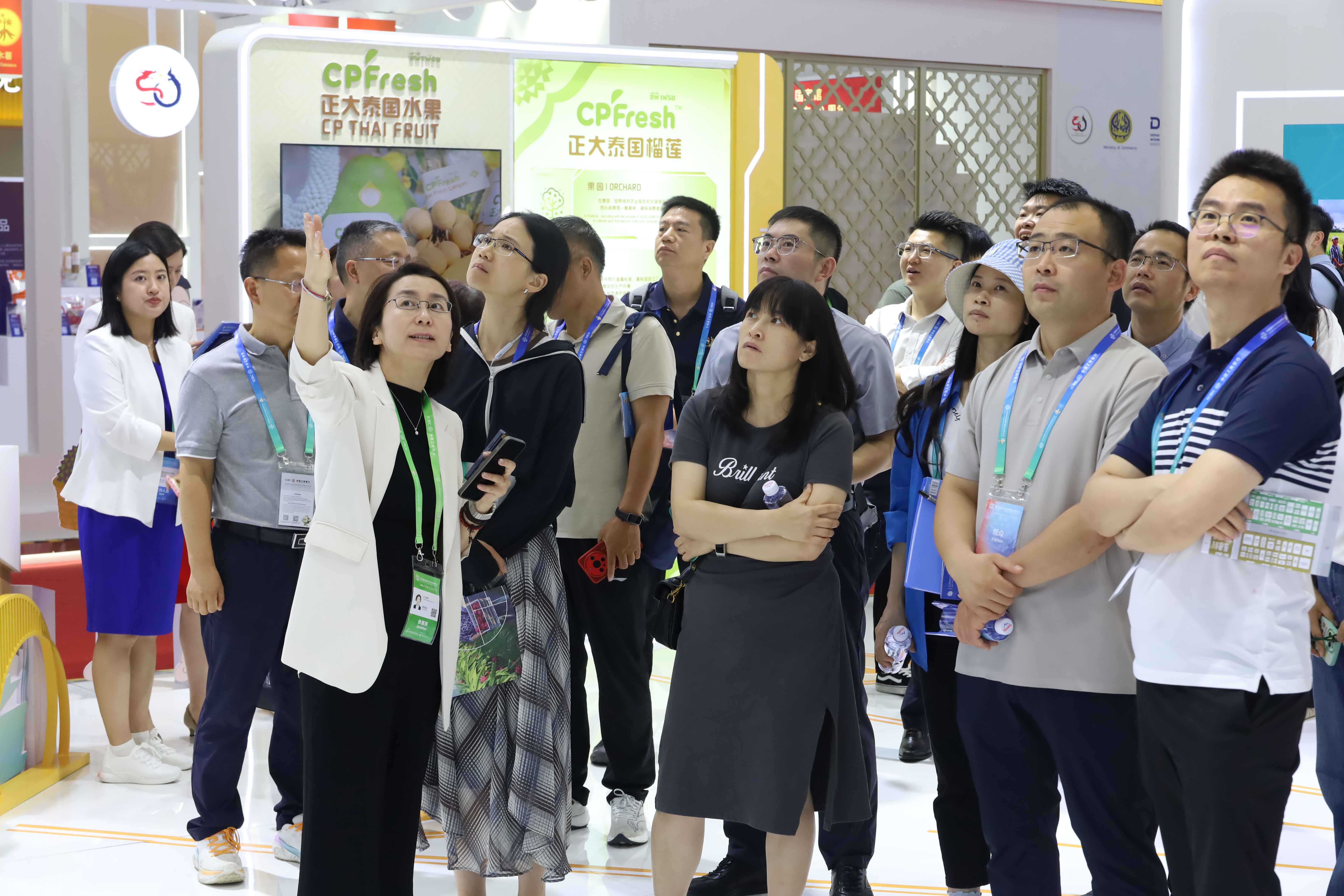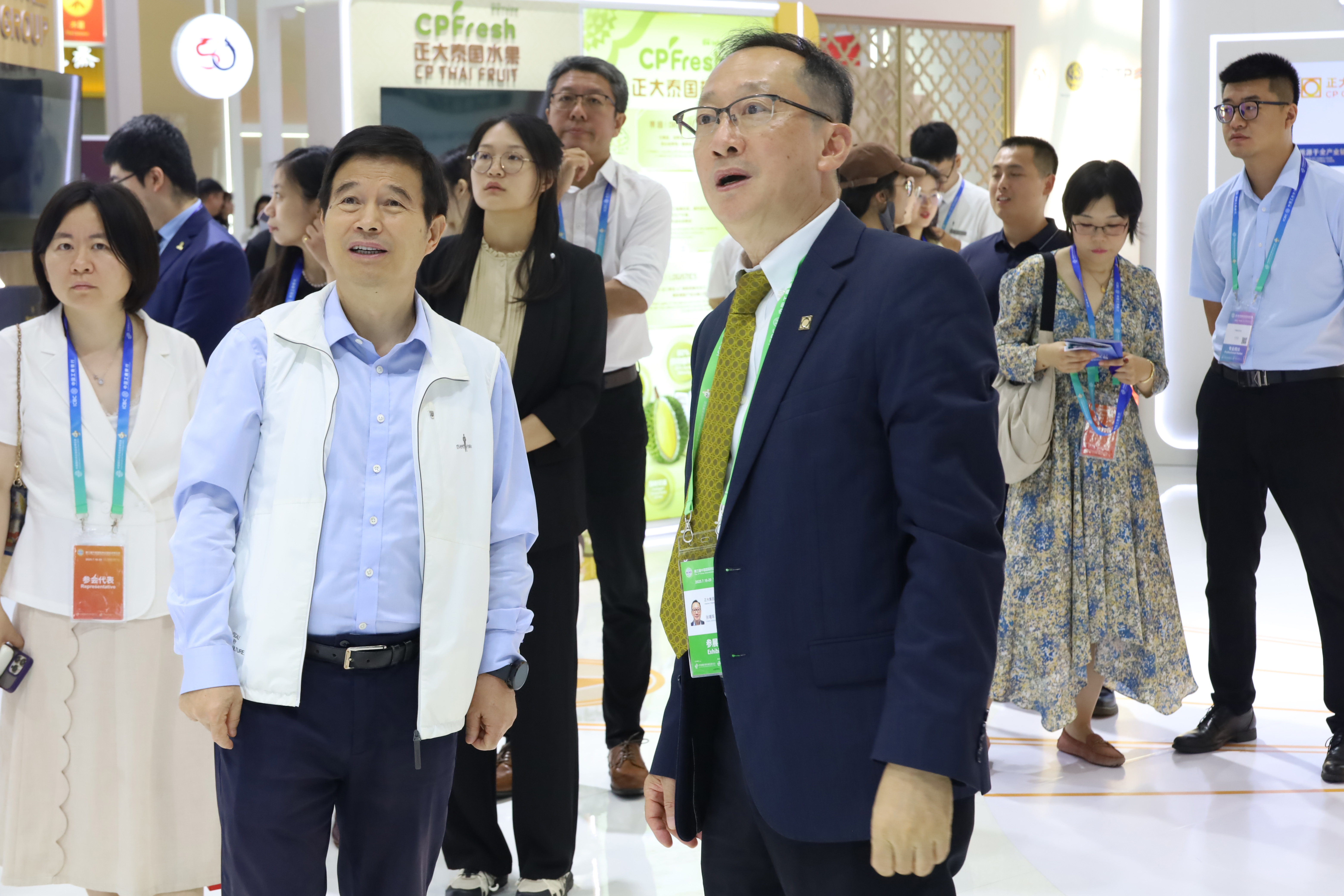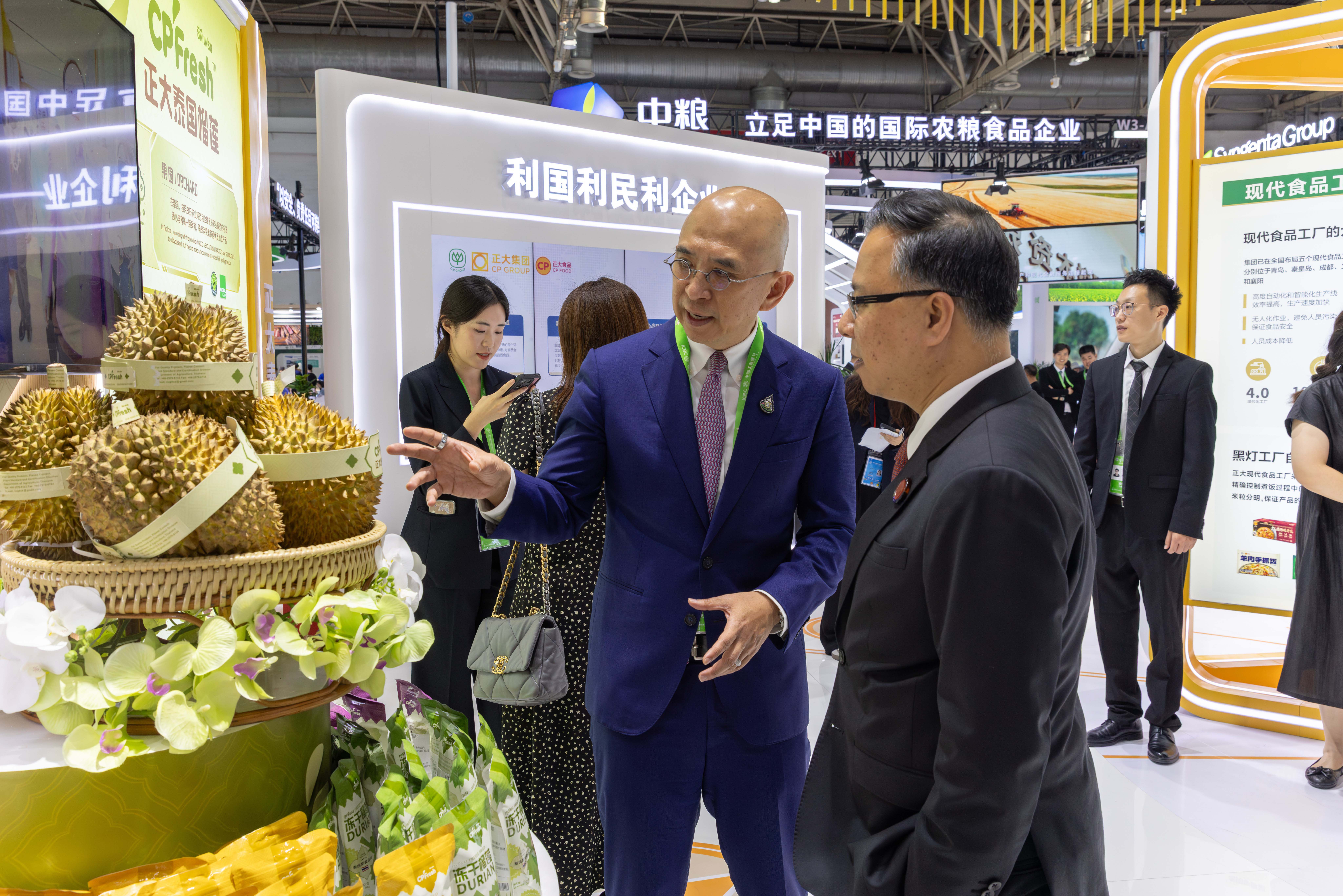 內(nèi)蒙古自治區(qū)人大常委會(huì)黨組副書記、常務(wù)副主任林少春(右)一行參觀正大展館,楊森源財(cái)務(wù)長(zhǎng)(左)熱情接待來賓并介紹正大泰國(guó)榴蓮。