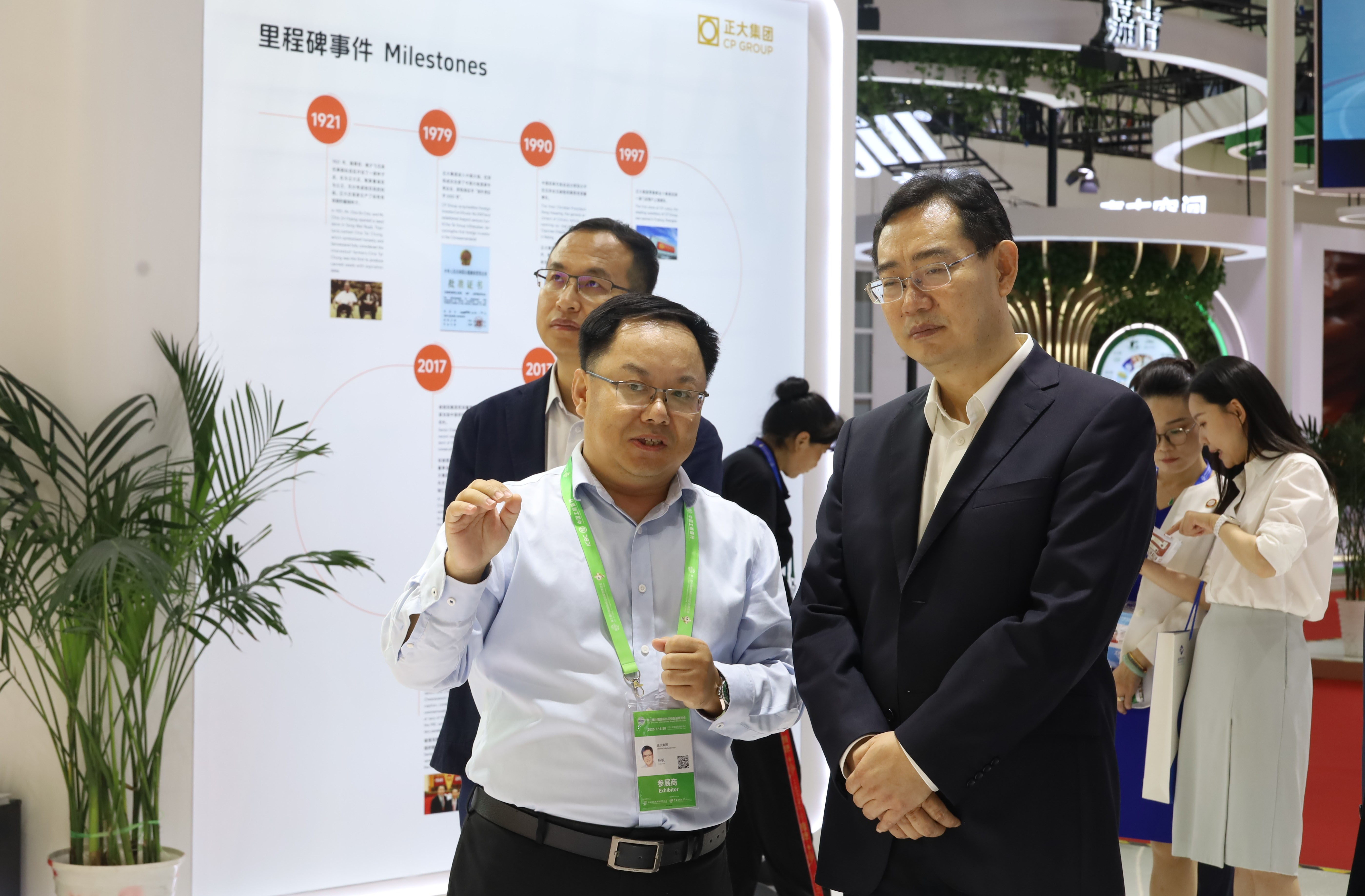 農(nóng)業(yè)農(nóng)村部對(duì)外經(jīng)濟(jì)合作中心一行參觀正大展館,王恩川副總裁(右一)熱情接待來賓。