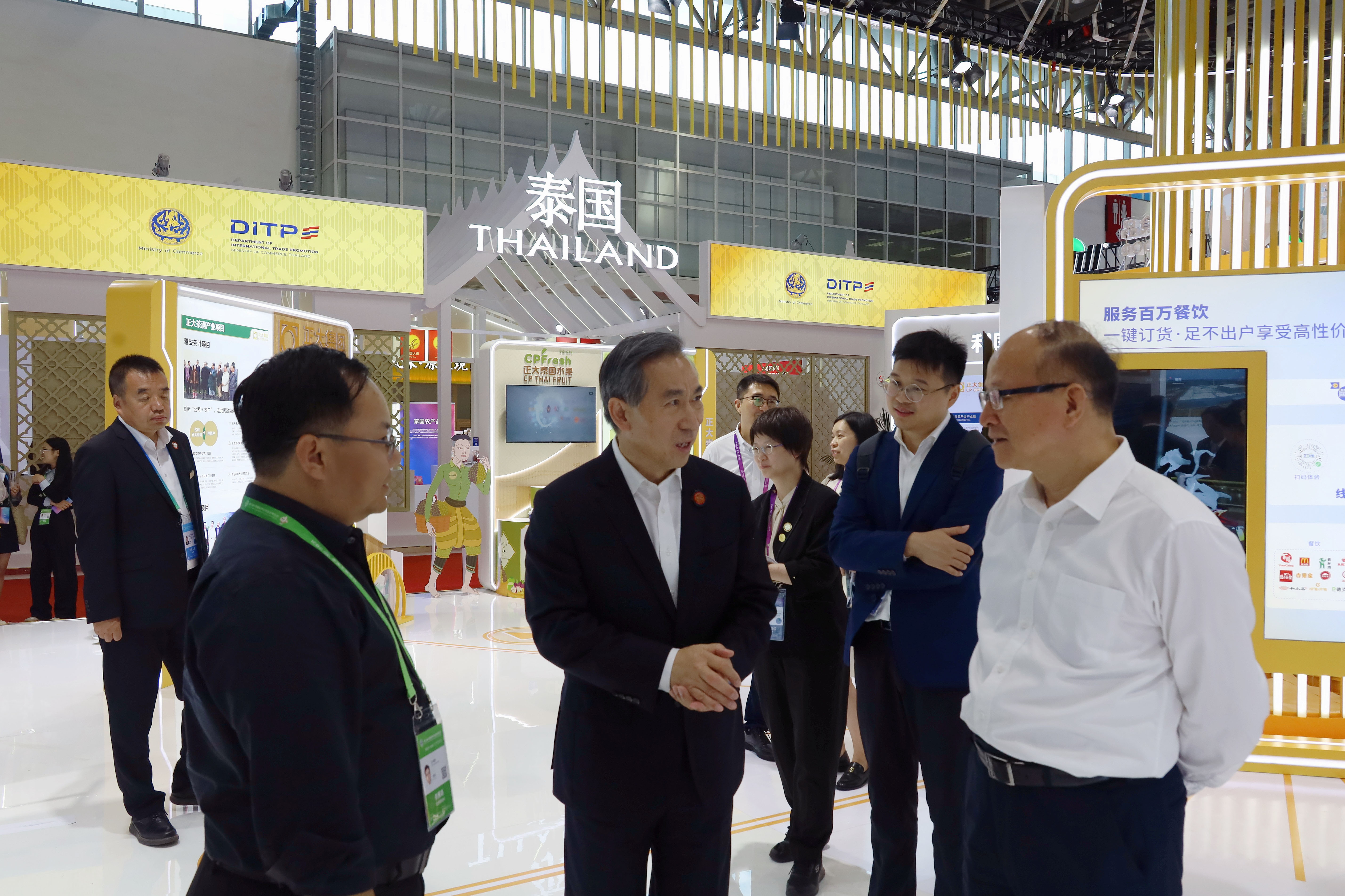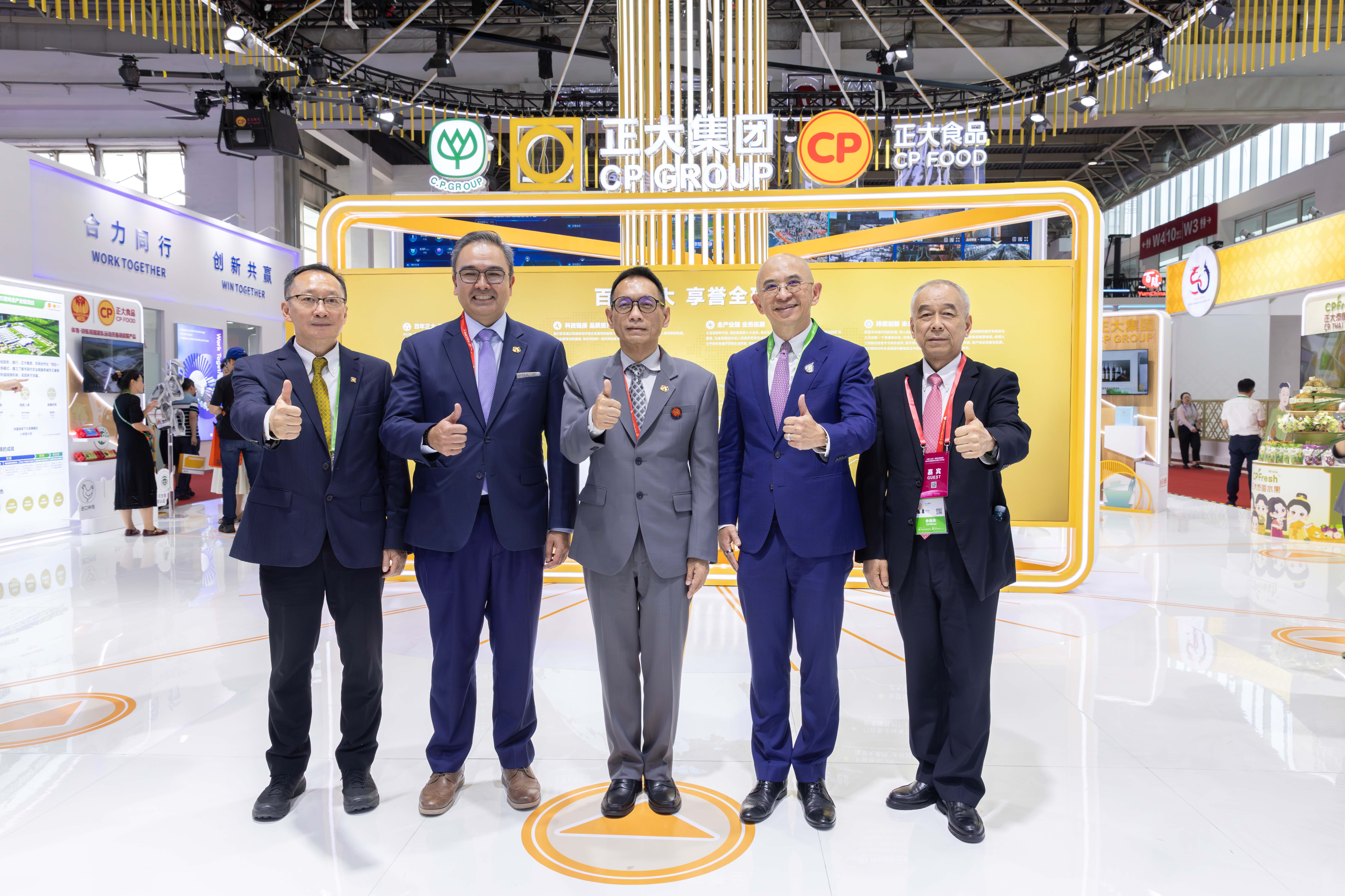 泰國(guó)商務(wù)部副次長(zhǎng)艾卡闡·斯達(dá)瓦拉瀾(中)一行參觀正大展館,正大集團(tuán)中國(guó)區(qū)財(cái)務(wù)長(zhǎng)楊森源(右二)熱情接待泰國(guó)政府來賓,集團(tuán)農(nóng)牧食品企業(yè)中國(guó)區(qū)資深副董事長(zhǎng)薛增一(右一)、中國(guó)區(qū)市場(chǎng)中心資深總裁張曙暉(左一)陪同接待并一同合影留念。