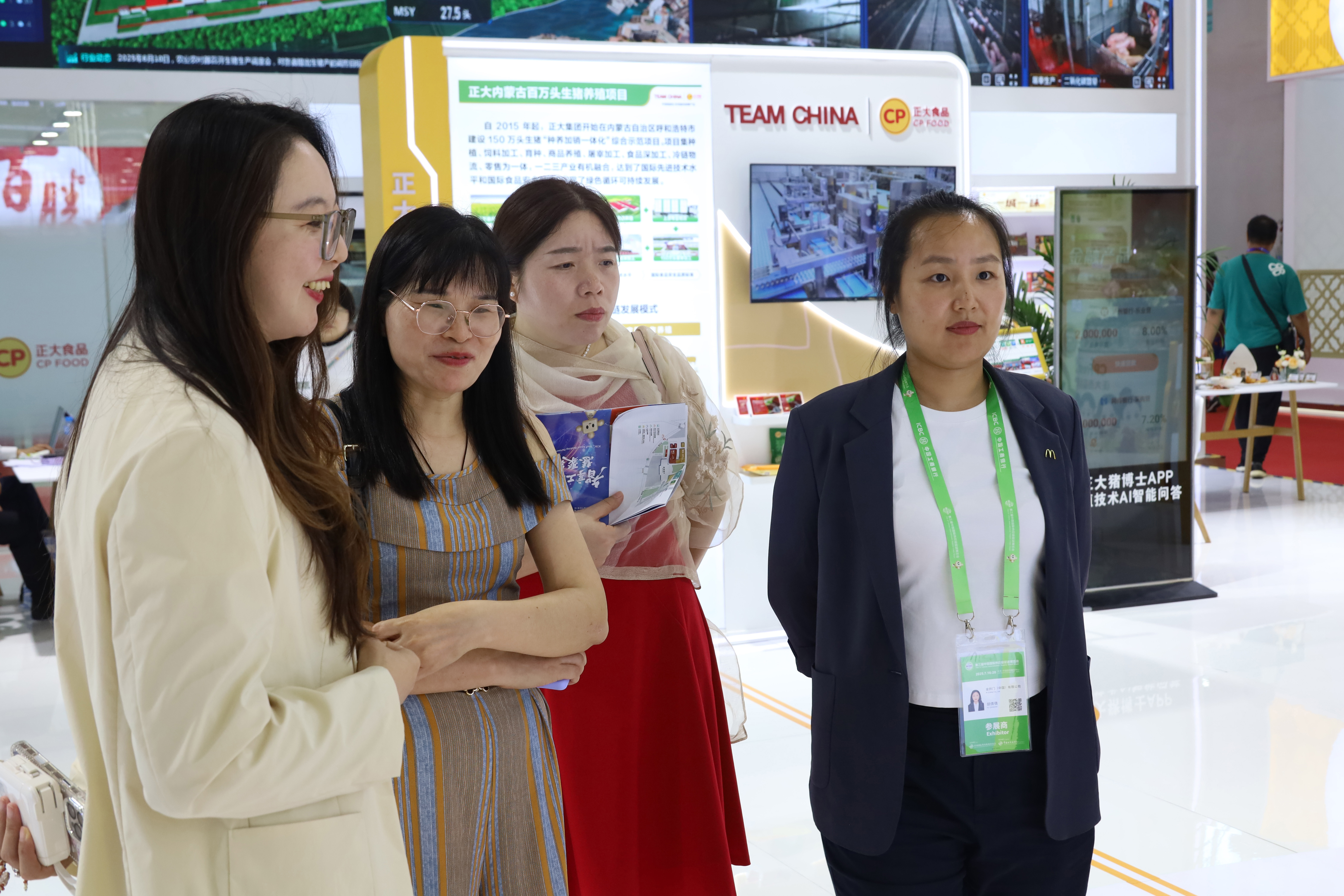麥當(dāng)勞合作伙伴展團(tuán)一行參觀正大展館,正大集團(tuán)農(nóng)牧食品企業(yè)中國(guó)區(qū)市場(chǎng)中心品牌傳播經(jīng)理孟徽(左一)熱情接待來賓。
