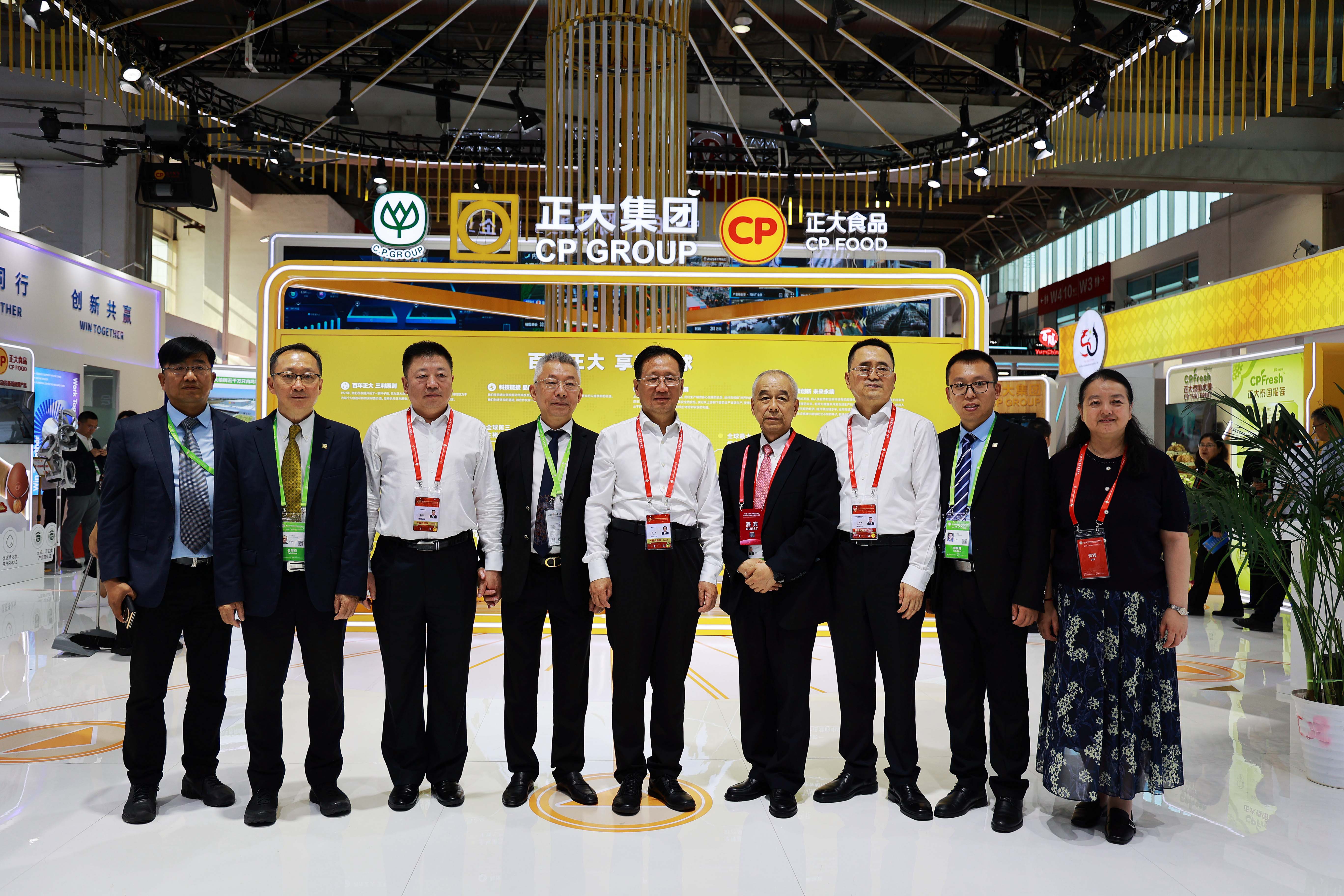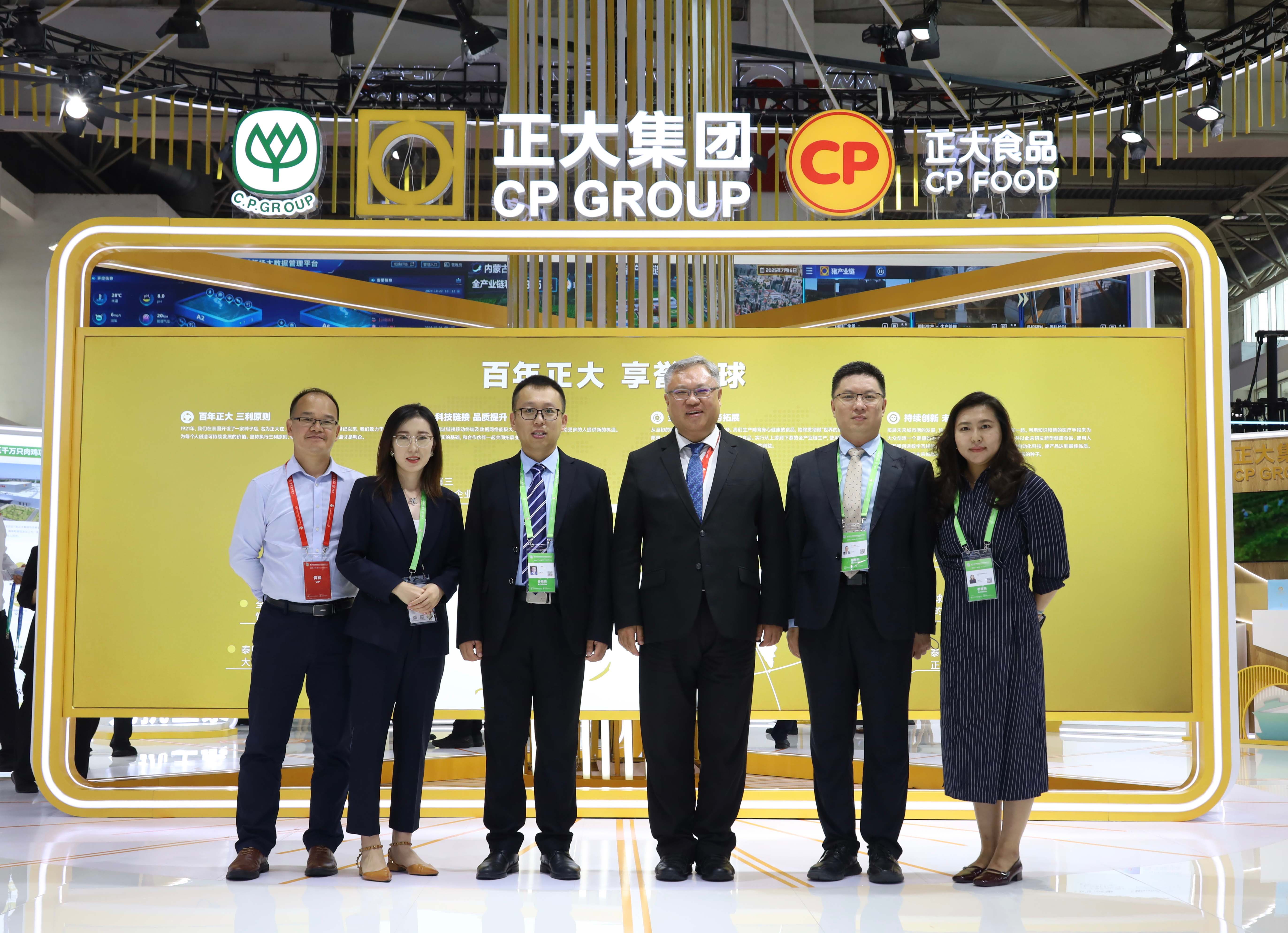 中糧集團(tuán)對(duì)外合作部總監(jiān)陳剛(右三)一行參觀正大展館,正大集團(tuán)農(nóng)牧食品企業(yè)中國(guó)區(qū)食品研發(fā)中心總裁王冶(右二)、王恩川副總裁(左三)、正大北京戰(zhàn)區(qū)市場(chǎng)部總監(jiān)周賀(左二)等熱情接待來賓并合影留念。