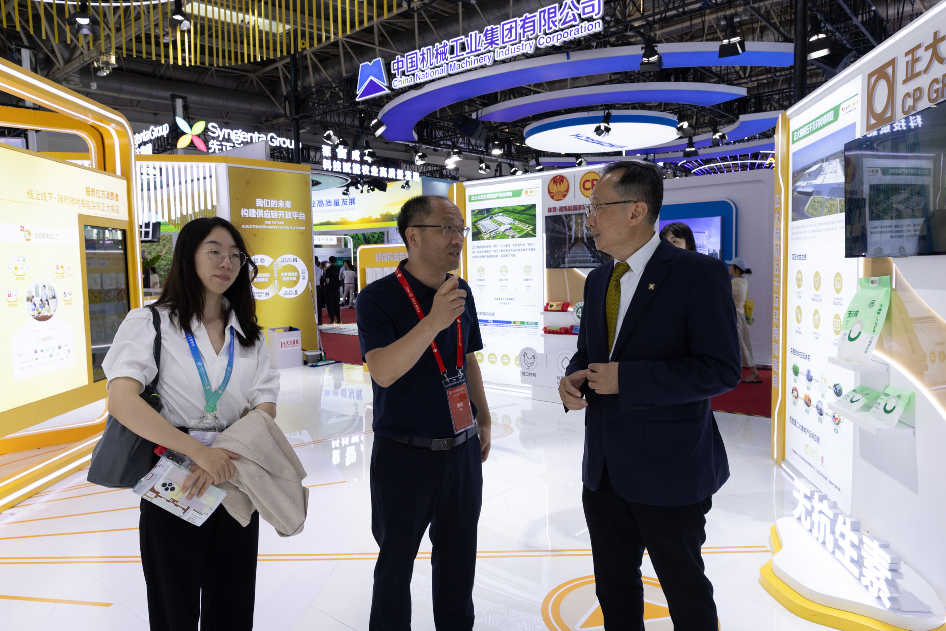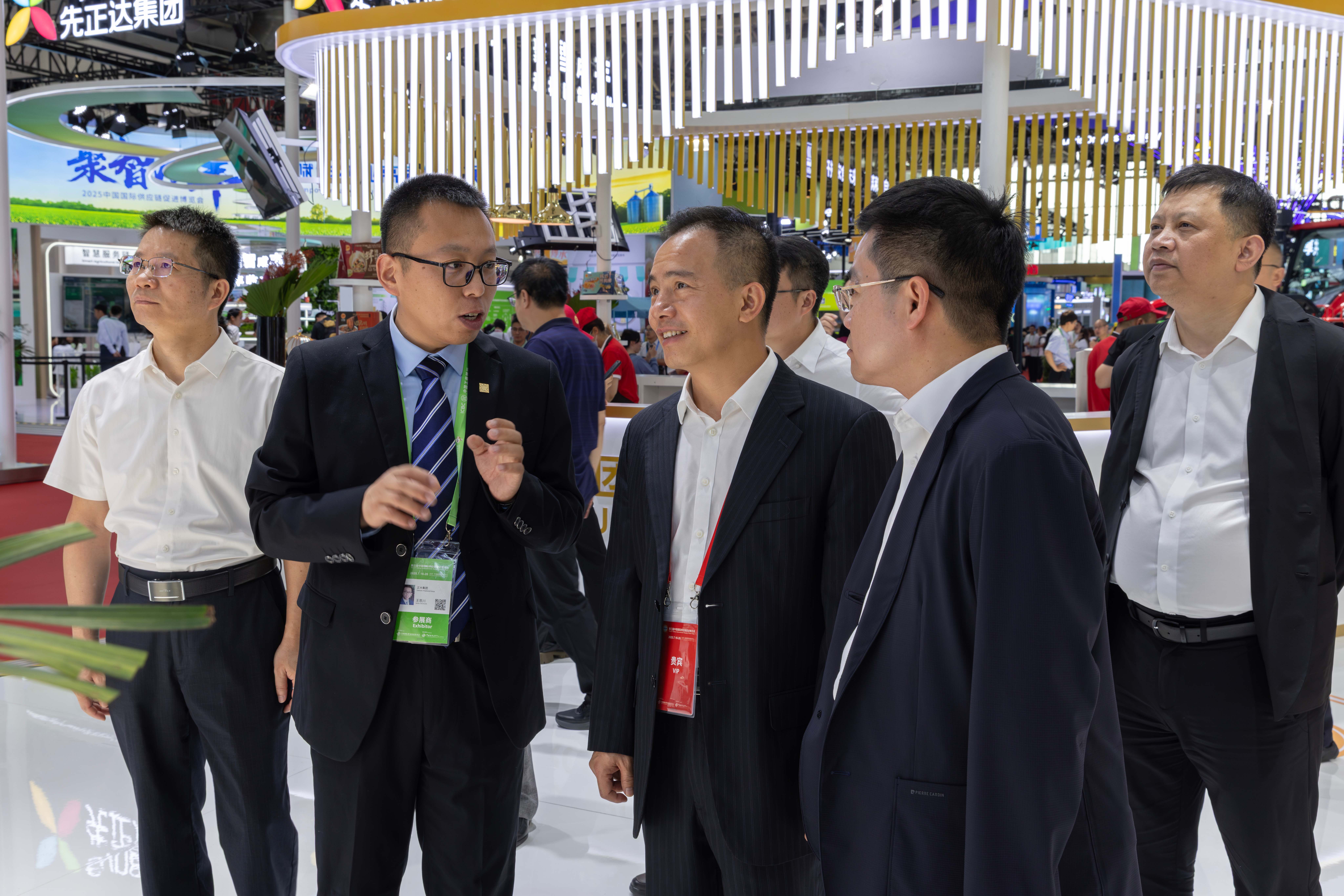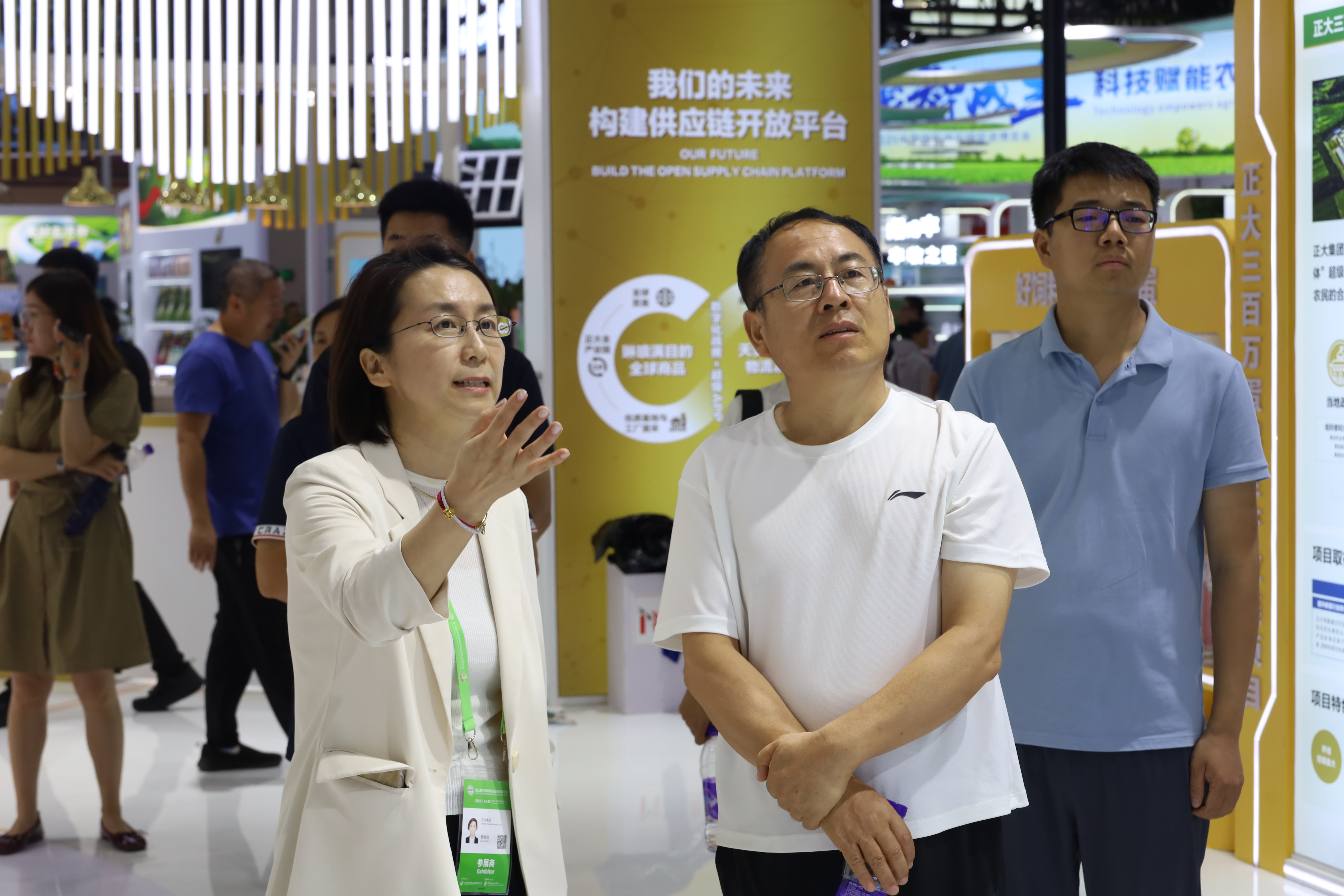 農(nóng)業(yè)農(nóng)村部科技教育司農(nóng)技處一行參觀正大展館,張曙暉資深總裁(右)熱情接待來賓。