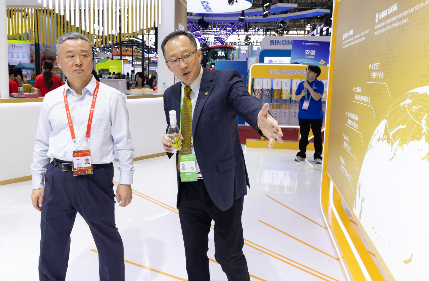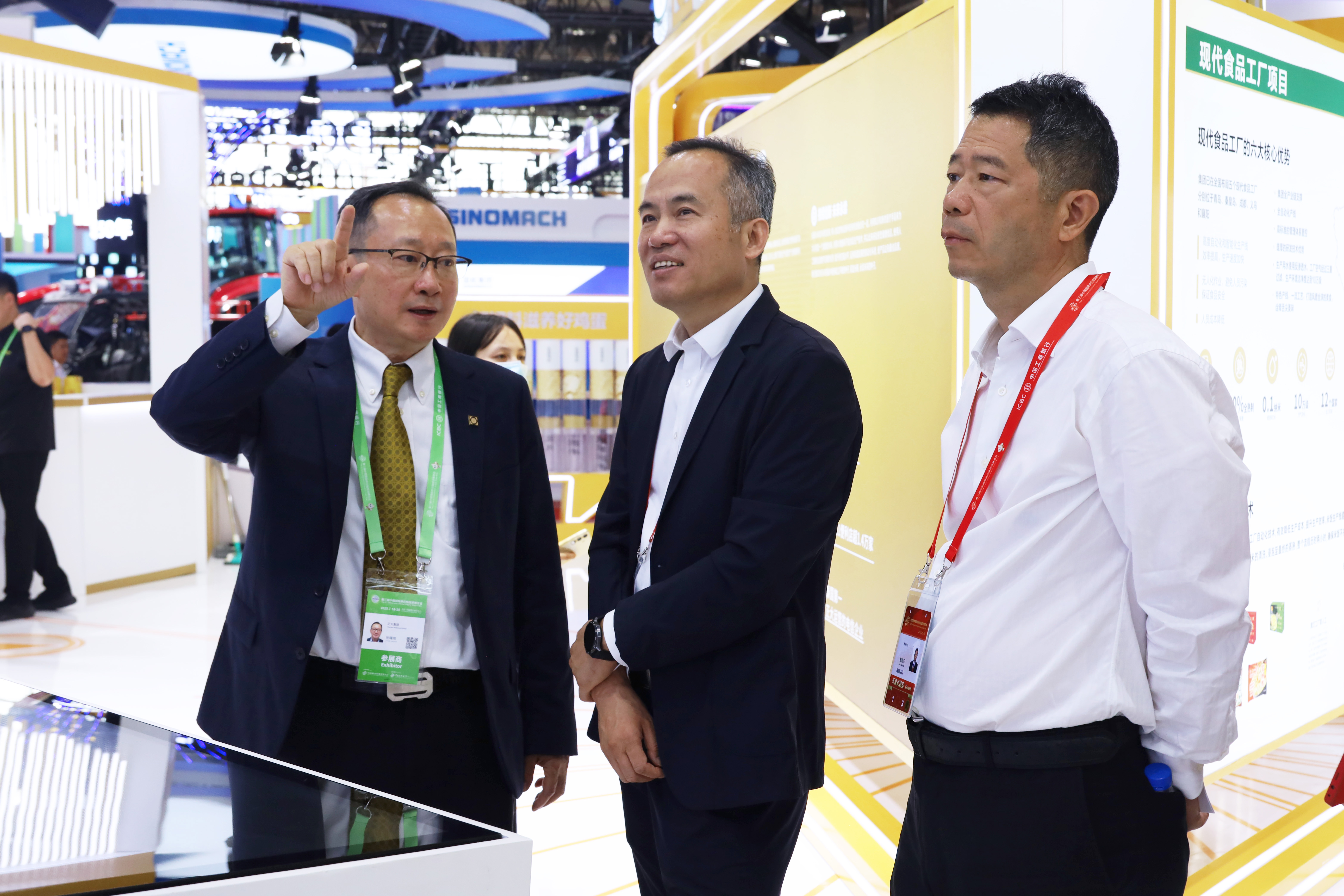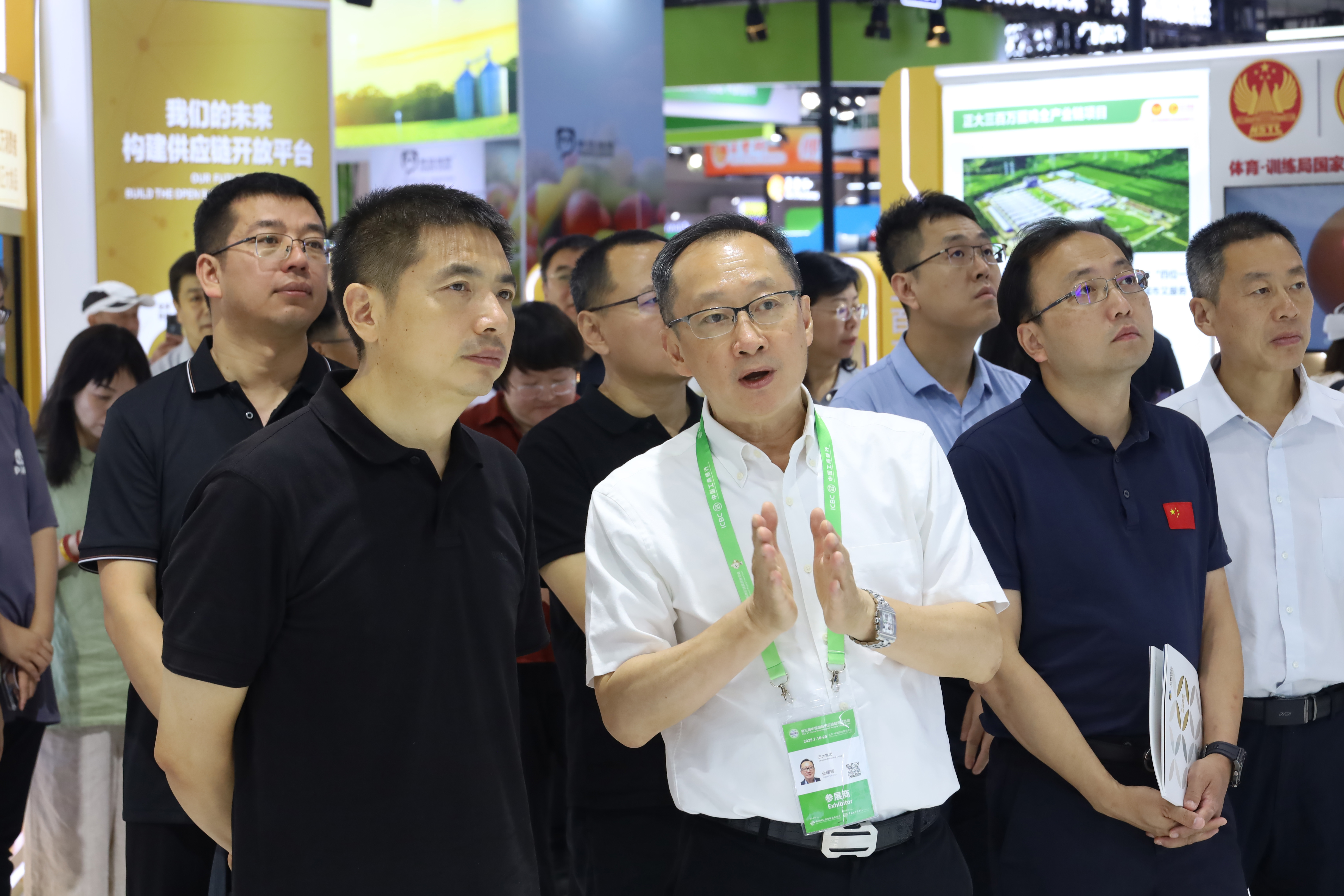 農(nóng)業(yè)農(nóng)村部科技教育司農(nóng)技處一行參觀正大展館,張曙暉資深總裁(右)熱情接待來賓。