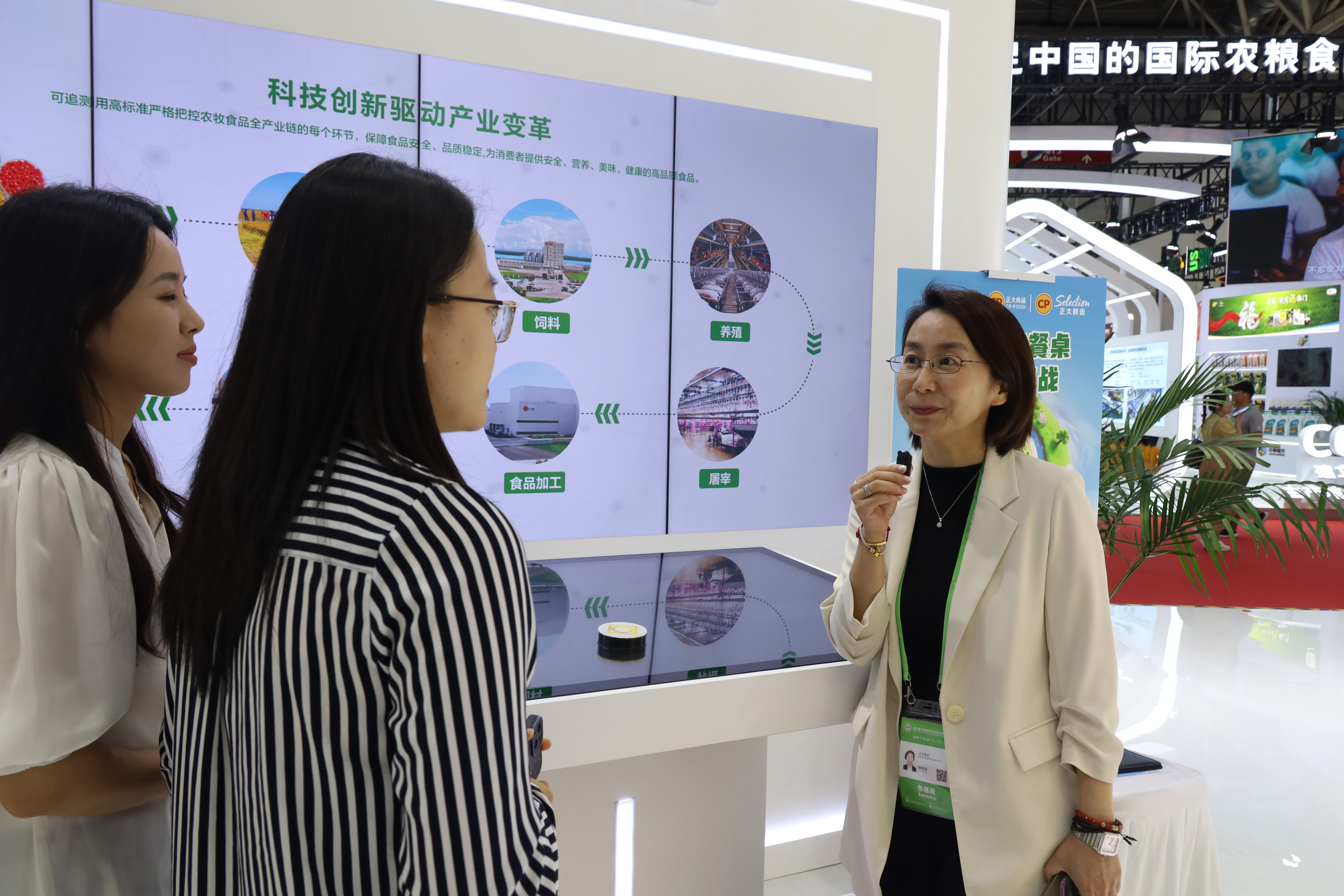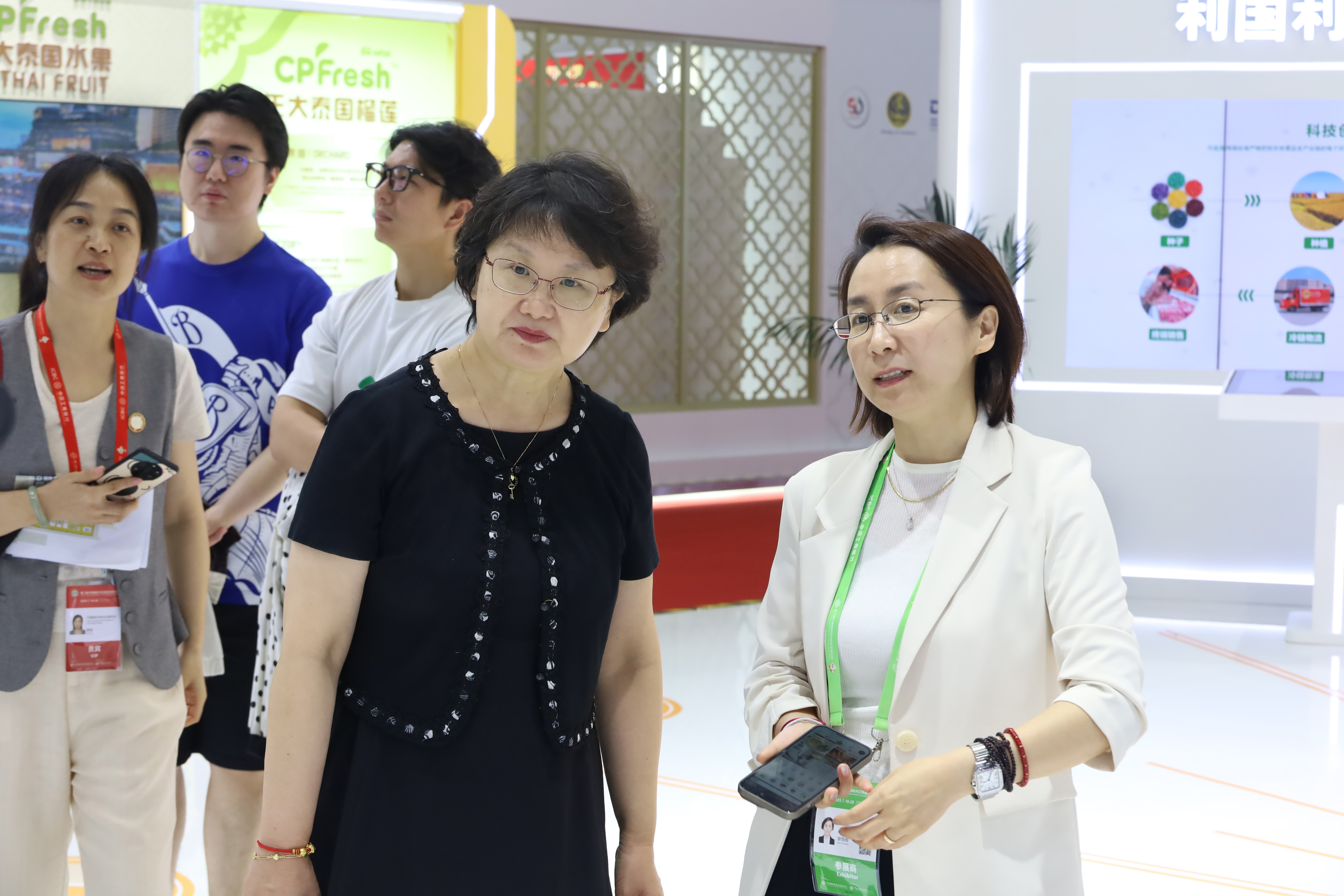 商務(wù)部歐亞司一行參觀正大展館,正大集團(tuán)農(nóng)牧食品企業(yè)中國(guó)區(qū)市場(chǎng)中心品牌傳播總監(jiān)郭悅楊(右)熱情接待來賓。