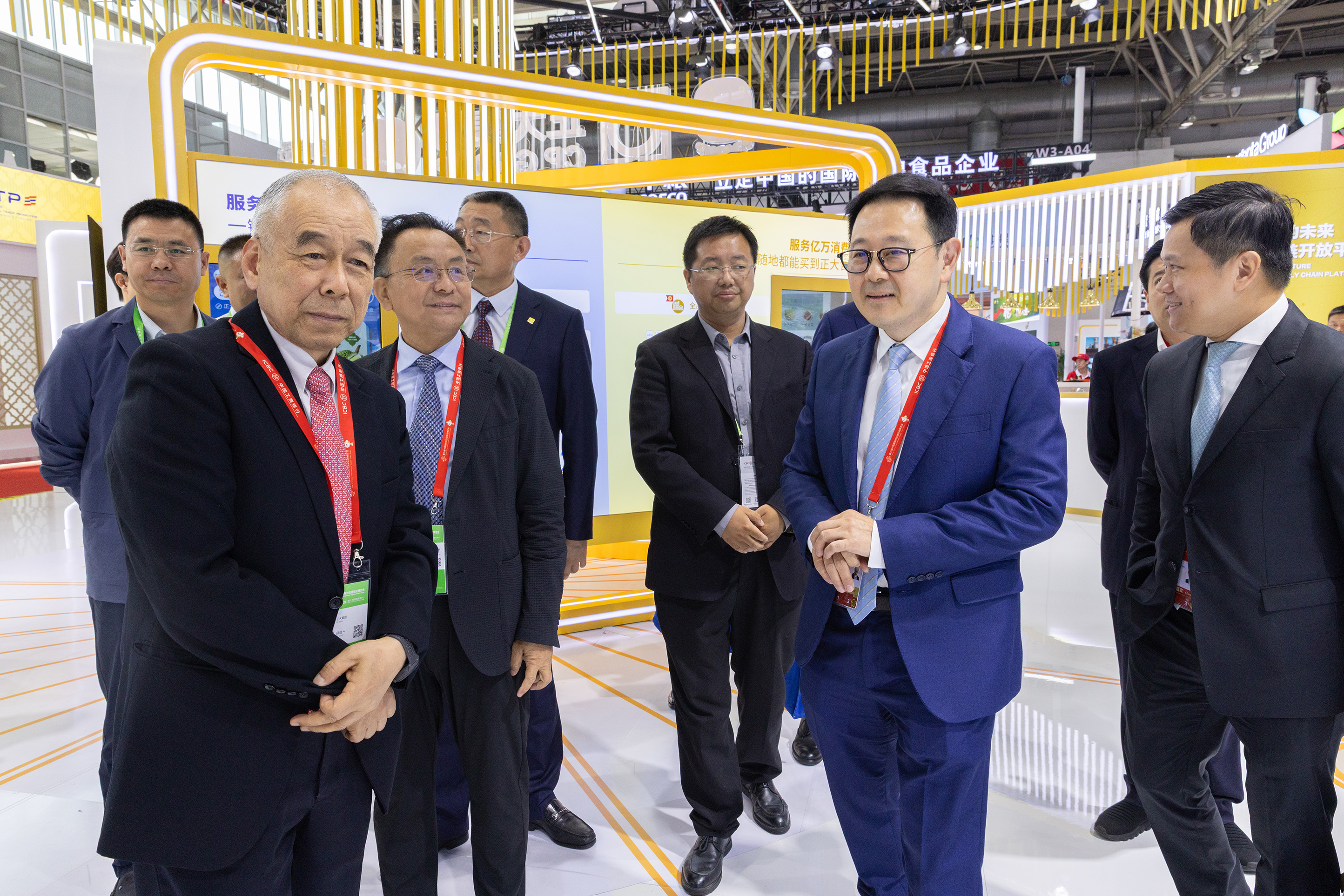 中國(guó)貿(mào)促會(huì)會(huì)長(zhǎng)任鴻斌(中)、副會(huì)長(zhǎng)陳建安(右一)一行參觀正大展館,正大集團(tuán)農(nóng)牧食品企業(yè)中國(guó)區(qū)市場(chǎng)中心市場(chǎng)活動(dòng)總監(jiān)楊帆(左一)熱情接待來賓。任鴻斌會(huì)長(zhǎng)高度評(píng)價(jià)正大展館,他表示,正大集團(tuán)本屆參展效果突出,生態(tài)樹設(shè)計(jì)深度契合鏈博會(huì)主題。考察正大內(nèi)蒙古百萬頭生豬養(yǎng)殖項(xiàng)目展區(qū)時(shí),他還特別稱贊:“正大全產(chǎn)業(yè)鏈?zhǔn)巢钠焚|(zhì)卓越。”